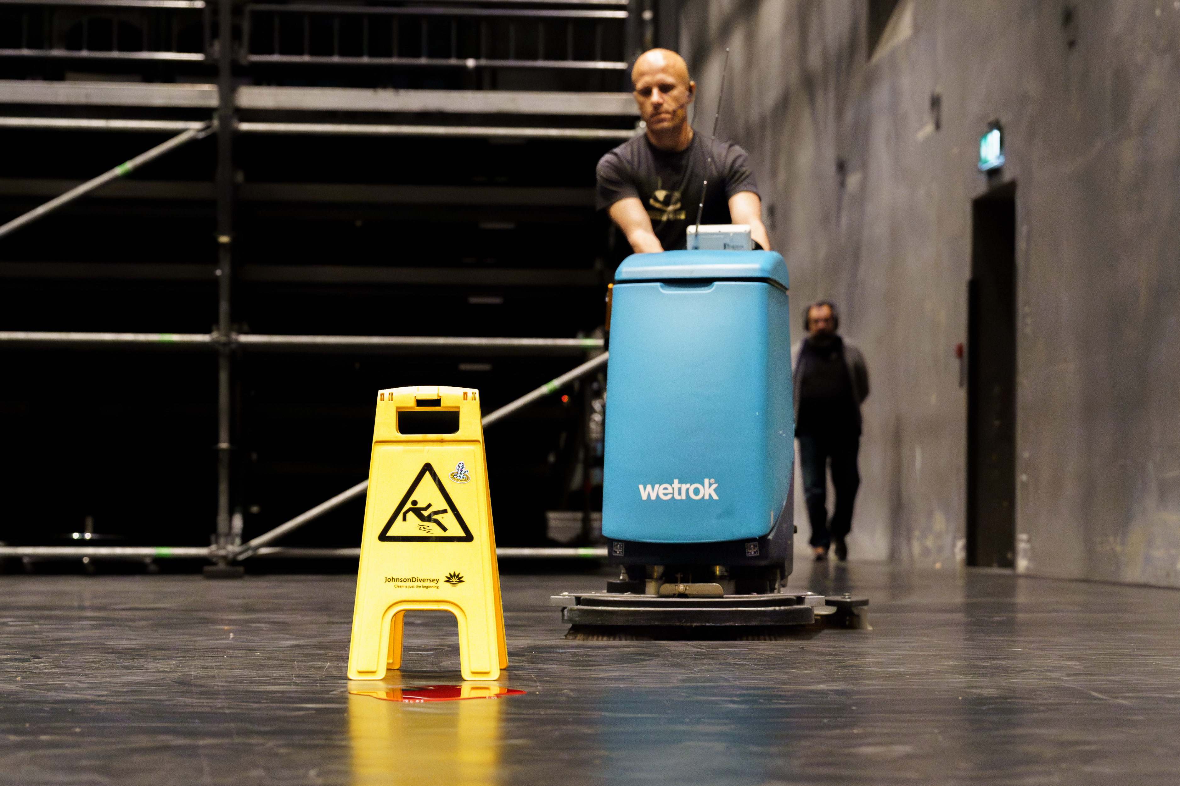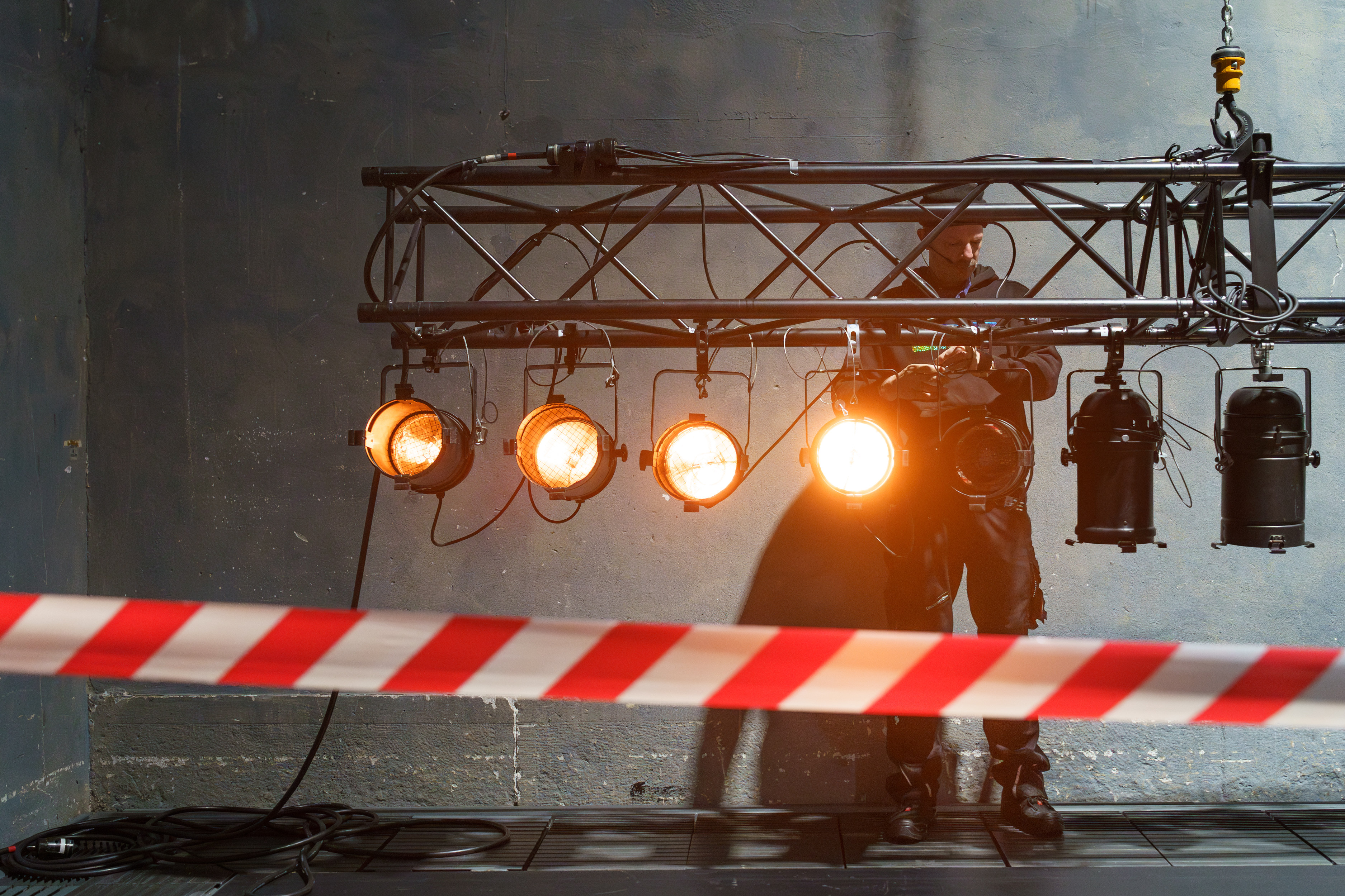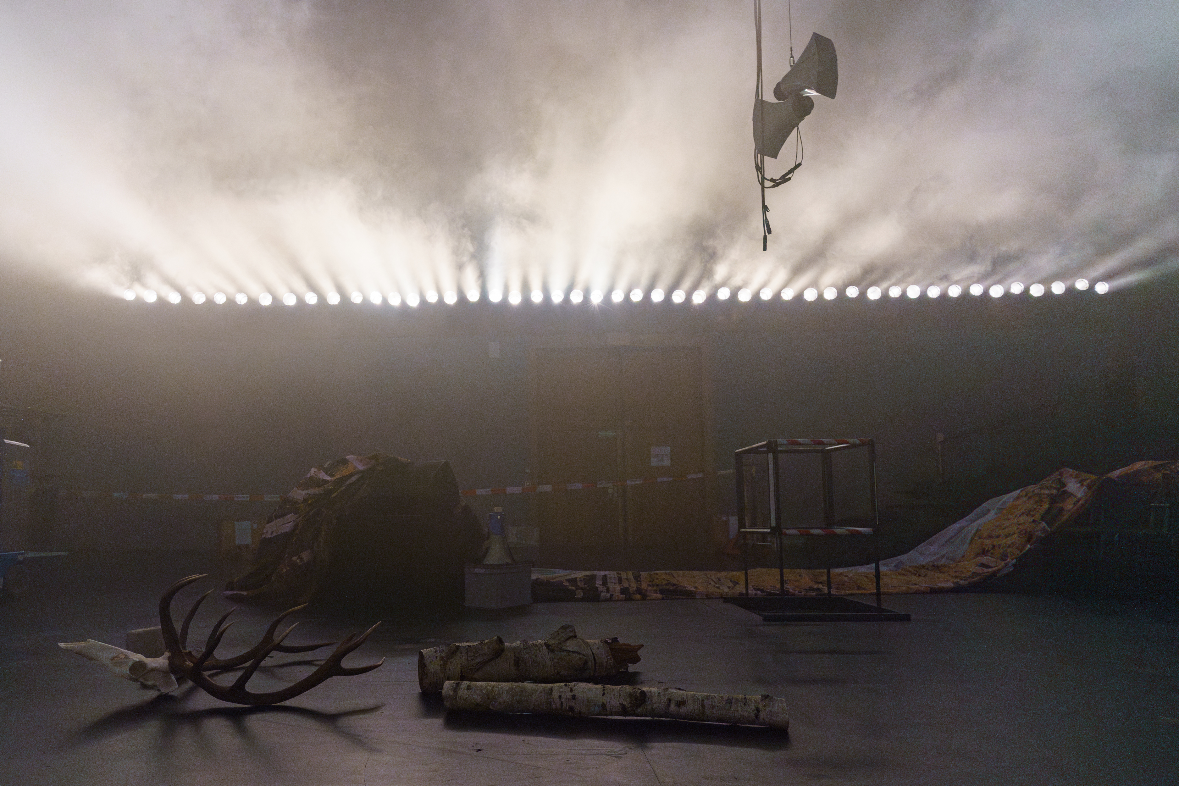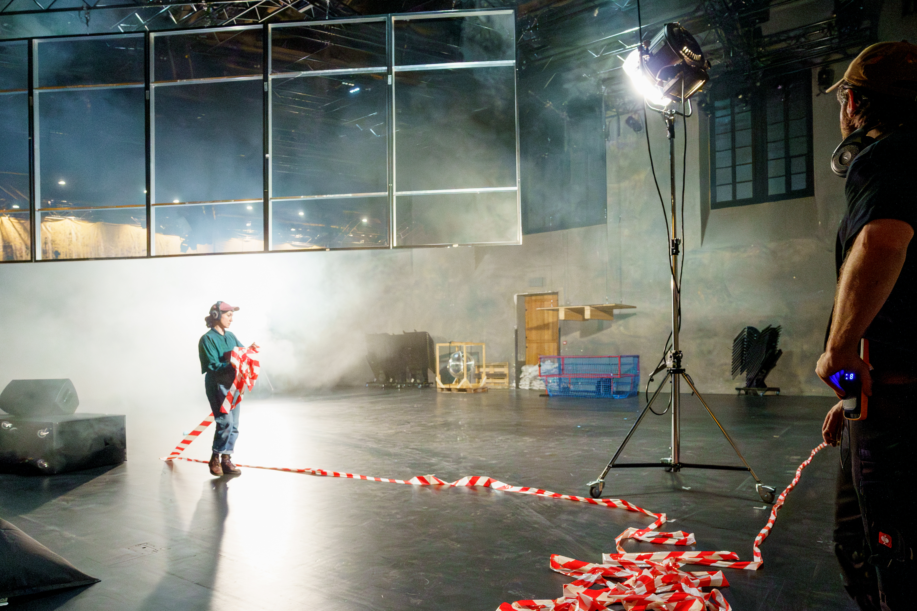 In In Case of Emergency führt sich der Theaterapparat selbst auf. Die grosse Halle der Gessnerallee wird zu einer frei begehbaren audiovisuellen Installation. Keine Performer:innen führen durch den Abend, sondern all die Personen – die Techniker:innen und Abenddienste – die für gewöhnlich im Hintergrund der Vorstellungen für einen sicheren und reibungslosen Betrieb sorgen. Sie weisen den Weg, vollziehen offene Umbauten und Materialprüfungen, spielen Musik und simulieren entlang der vorherrschenden Sicherheitsbestimmungen den Störfall und die Katastrophe im Theater.
